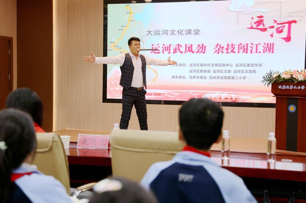 沧州市运河区“大运河文化课堂”系列活动走进沧州市迎宾路第二小学。王杰摄近日,沧州市运河区“大运河文化课堂”系列活动走进沧州市迎宾路第二小学。活动以“运河武风劲 杂技闯江湖”为主题,邀请专家与师生面对面,以专题讲座、现场展演等形式解码大运河畔武术与杂技的文化基因。